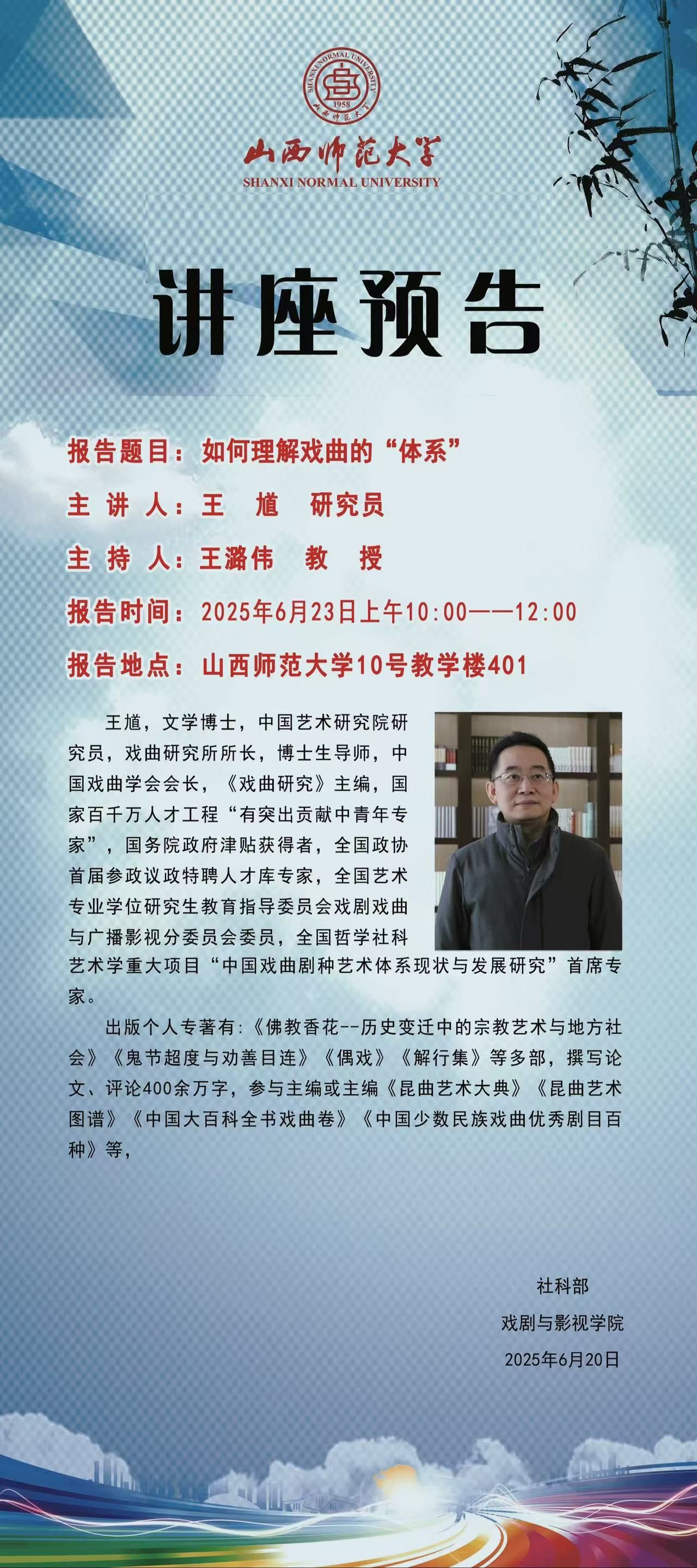 太阳成tyc拟于6月23日(周一)10:00-12:00在南区10号楼401会议室举办《如何理解戏曲的‘体系’》讲座,主讲人为王馗研究员,本次讲座由王潞伟教授主持。