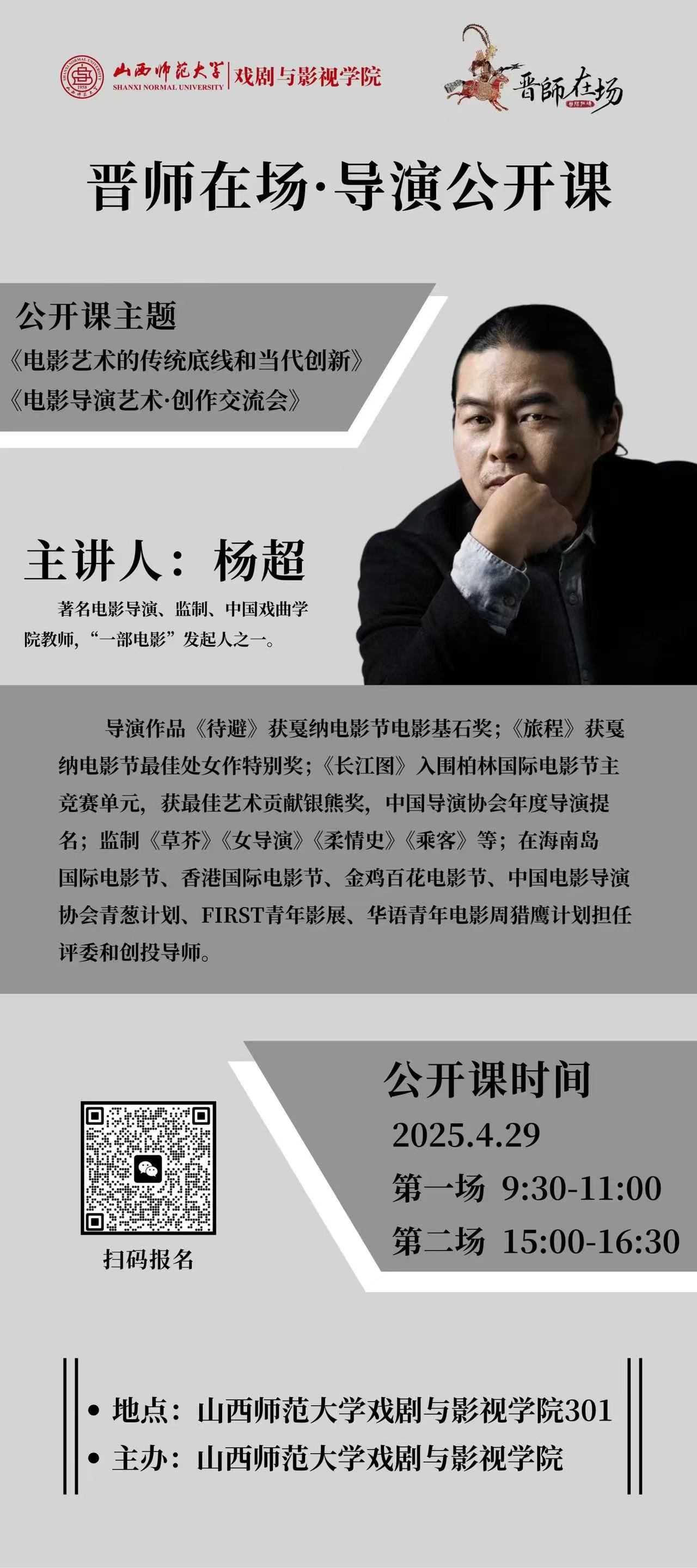 太阳成tyc拟4月29日(周二)09:30-11:00和15:00-16:30两个时间段在南区10号楼401会议室举办《电影艺术的传统底线和当代创新》和《电影导演艺术·创作交流会》讲座,主讲人为杨超导演。