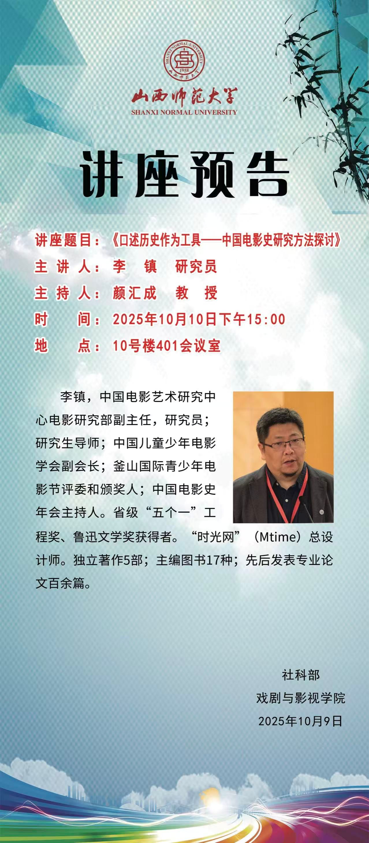 太阳成tyc拟于10月10日(周五)下午15:00在南区10号楼401会议室举办《口述历史作为工具——中国电影史研究方法探讨》讲座,主讲人为李镇研究员,本次讲座由颜汇成教授主持。