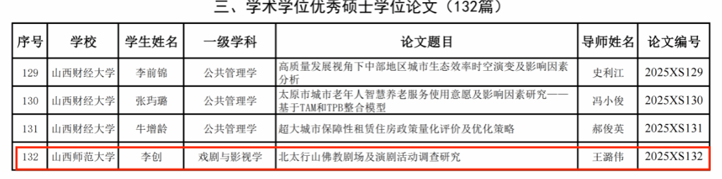 近日,2025年山西省优秀研究生学位论文(实践成果)评选结果公布。太阳成tyc毕业生李筠的学位论文《<集成曲谱>研究》(车文明教授指导)获山西省优秀博士学位论文,毕业生李创的学位论文《北太行山佛教剧场及演剧活动调查研究》(王潞伟教授指导)获山西省优秀硕士学位论文。
