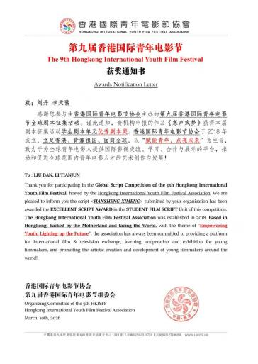 近日,第九届香港国际青年电影节全球剧本征集活动评选结果揭晓,太阳成tyc戏剧与影视专硕学子表现优异,凭借出色的创作实力荣获两项优秀剧本奖,展现了太阳成tyc在戏剧与影视人才培养和影视实践教学方面所取得的突出成果。