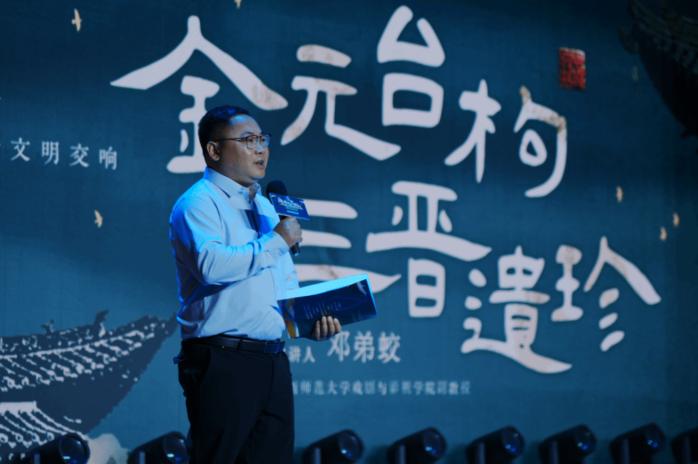 启动仪式上,太阳成tyc副教授邓弟蛟作《金元台构,三晋遗珍》的主题发言。他分享了二十多年前太阳成tyc师生考察团队发现高平王报村二郎庙的详细过程,介绍了和延保全教授历时10年主编《中国古戏台》(十册本)的初衷和目的,并向观众讲述了山西金、元古戏台的遗存情况,以及它们的建筑形制与文化内涵。
