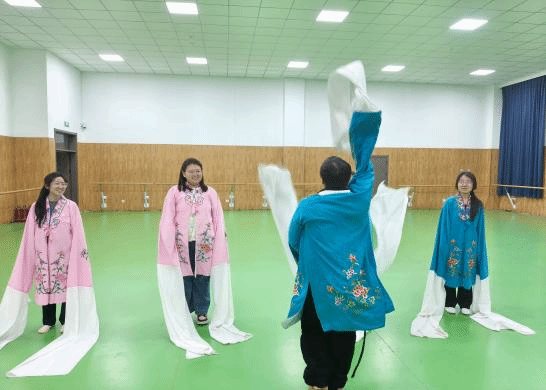 本次课程聚焦戏曲基础技艺传授。花枪训练中,老师引入“转身花”“背后花”等进阶技法,帮助学员掌握戏曲武戏的节奏感与表现力。唱腔部分则聚焦于情感表达与行腔技巧,引导学员在演唱中融入情绪。舞剑课程在巩固剑花基础的同时,加入了“翻身剑”等组合动作,展现戏曲身段的流畅。水袖体验环节中,老师耐心示范甩袖等基础动作,引导员工感受水袖的飘逸韵律。