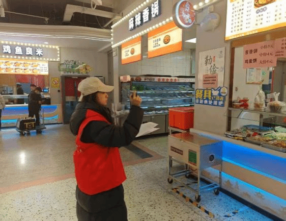 督查过程中,志愿者们分工明确,耐心走访每一个餐饮窗口,用手机拍摄记录下公示的餐品价格,认真核对影像资料与表格信息,明确饭菜定价,对价格进行全方位把关。活动尾声,志愿者们归还马甲与表格,此次爱心督查画上圆满句号。